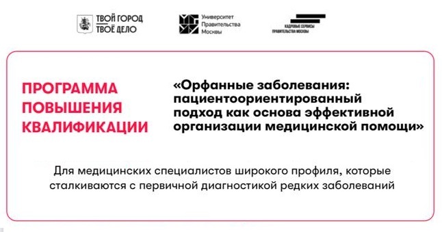 «Орфанные заболевания: пациентоориентированный подход как основа эффективной организации медицинской помощи» в рамках программы обучения руководителей и специалистов органов исполнительной власти и бюджетных учреждений города Москвы, в т.ч., главных врачей и заместителей руководителей медицинских организаций, подведомственных Департаменту здравоохранения г. Москвы